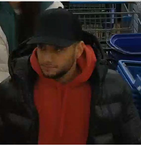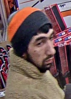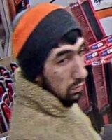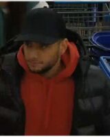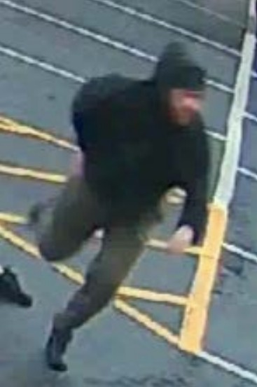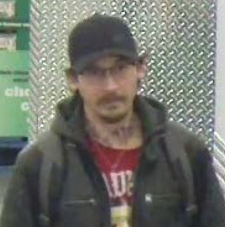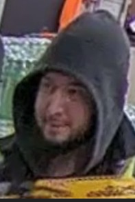 The suspect pictured, is described as wearing a black Under- Armour hat, green hoodie, grey pants, black and white New Balance shoes. He had a brown beard.