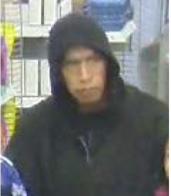 Suspect is described as approximately 40 years old with a medium build. He was wearing a black baseball cap, black jacket with a hood, red t-shirt, grey pants, black and brown shoes.